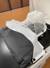 体を安定させ、毎回同じ姿勢で治療を行うために、「シェル(熱可塑性樹脂)」と呼ばれる固定具を個別に作成することがあります。シェルは通気性のよいメッシュ状で、装着中も呼吸が苦しくなることはありません。(図2,3)