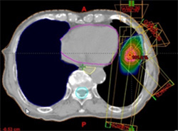 左乳がんの放射線治療では、通常呼吸のまま照射すると近くにある心臓にも放射線があたってしまうことがあります。