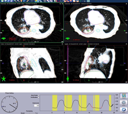 患者さまの呼吸状態をモニターで確認し、呼吸の特定の位置や息止め状態に合わせて照射する技術を用いています。(図11)