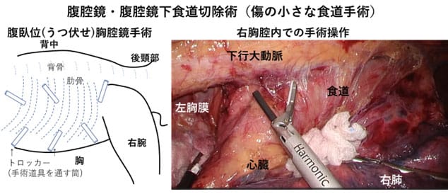 手術は、胸腔鏡、腹腔鏡による傷の小さな低侵襲手術を中心に行っています。低侵襲手術によって、術後の傷の痛みが少なく、術後の肺炎も少なくなるとされています。