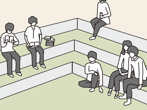 おおらかな階段状に計画されたオープンスペース。緑に覆われた屋外リビングのようなスペースは人々のくつろぎの場となります。イベント開催時にはステージとして利用することができます。