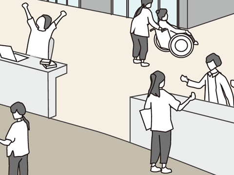 病院棟と大学棟をつなぐオープンスペース。南北に伸びるオープンテラスは建屋内の食堂やコンビニと結びつき、学生たちの休息・学習・議論の場となります。