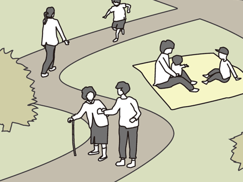 緑道とつながる丘上のオープンスペース。おおきな緑地に散策路を巡らせることで多方面からアプローチを受け入れます。地域に大きく開放されることで周辺の公園とシームレスにつなげます。