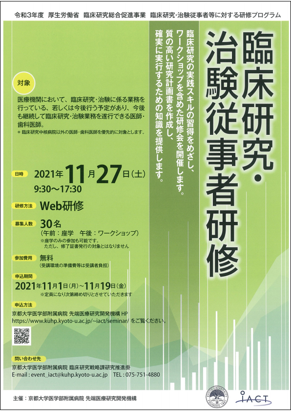 「臨床研究・治験従事者研修」2021年11月27日(土)9:30~17:30(Web研修)