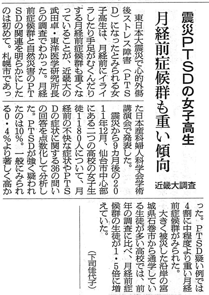 朝日新聞(5月14日付)へ武田 卓教授の研究(東日本大震災によるPTSDと月経前症候群との関連性)が掲載されました。