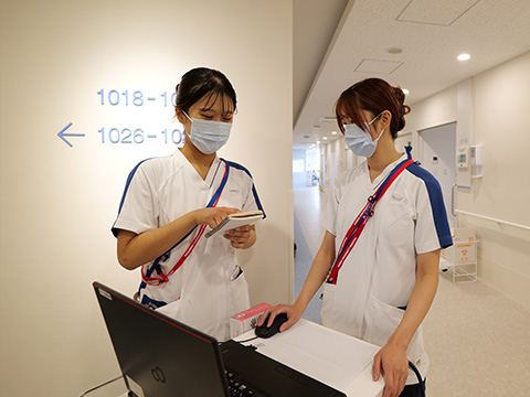 新人看護職員は「部署全体、チーム全体で育てる」という認識を共有し、医療現場で求められる看護実践能力を獲得できるように育成するとともに、メンタル面にも配慮しながらサポートしています。