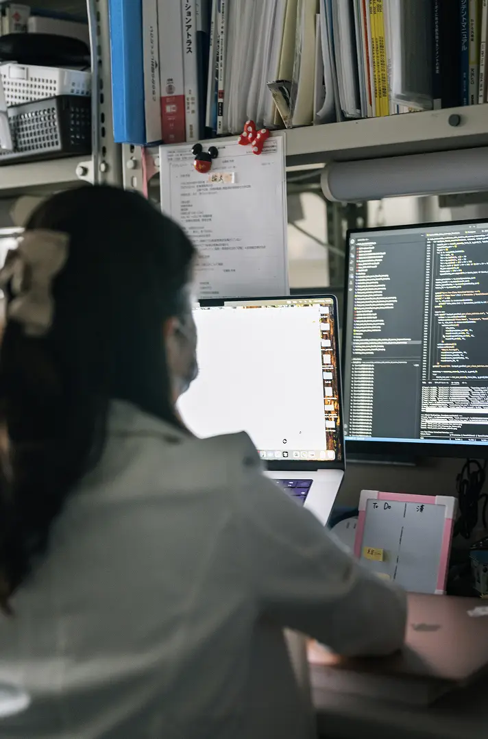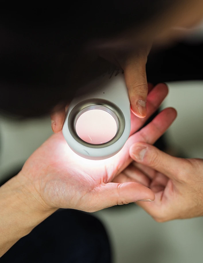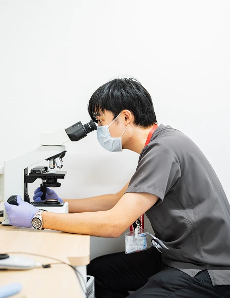 どんな病気も正しく診断することから治療は始まります。皮膚科にはたくさんの検査方法がありますが、それら皮膚科の検査のなかでも要となるのが生検といわれる皮膚病理検査です。私はその病理検査係を担当させていただいています。毎月100件を超える生検が当院では行われていますが、その中には皆様が日ごろから悩まれる疾患から、難病や希少疾患・悪性腫瘍といった専門的な疾患まで幅広い疾患が含まれています。診断に至るまで一筋縄ではいかない疾患も少なくありませんが、自分が直接担当する患者さんだけでなく、当院で病理検査を受けられた患者さん、一人一人の病気に向き合い、より良い診断からより良い治療へ繋がるための一助になるよう日々診療にあたっております。自分もまだまだ日々学ぶことばかりですが、たくさんいる医局員がより多くのことを学び、患者さんに還元できるような充実した医局を目指して仕事に取り組んでいきたいと思っています。