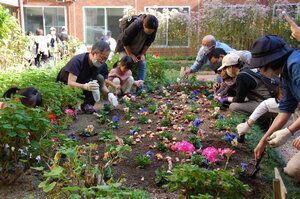 この庭園にこれらの球根が美しい花を咲かせることで、患者さまや病院で働く職員が安らぎを感じ、心地よいひとときを過ごすことを願い、当院教職員の家族を招いて植栽がレン オークメイド氏と共に行われました。