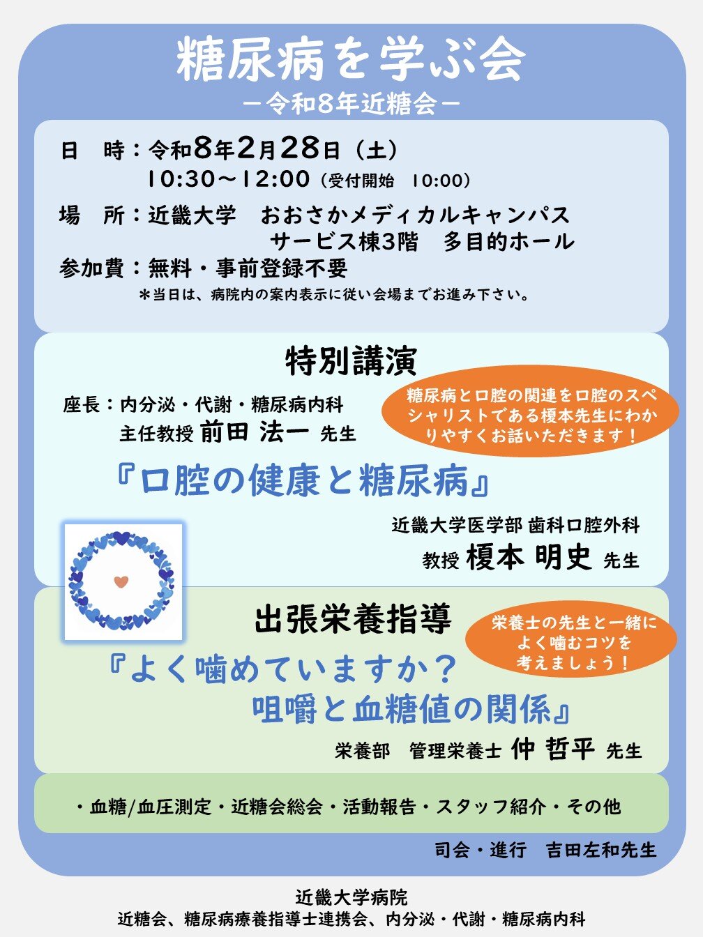 糖尿病と口腔の関連を口腔のスペシャリストが講演するほか、栄養士と一緒によく噛むコツについて考えます。血糖/血圧測定も体験できます。予約不要となりますのでぜひお気軽にご参加ください。