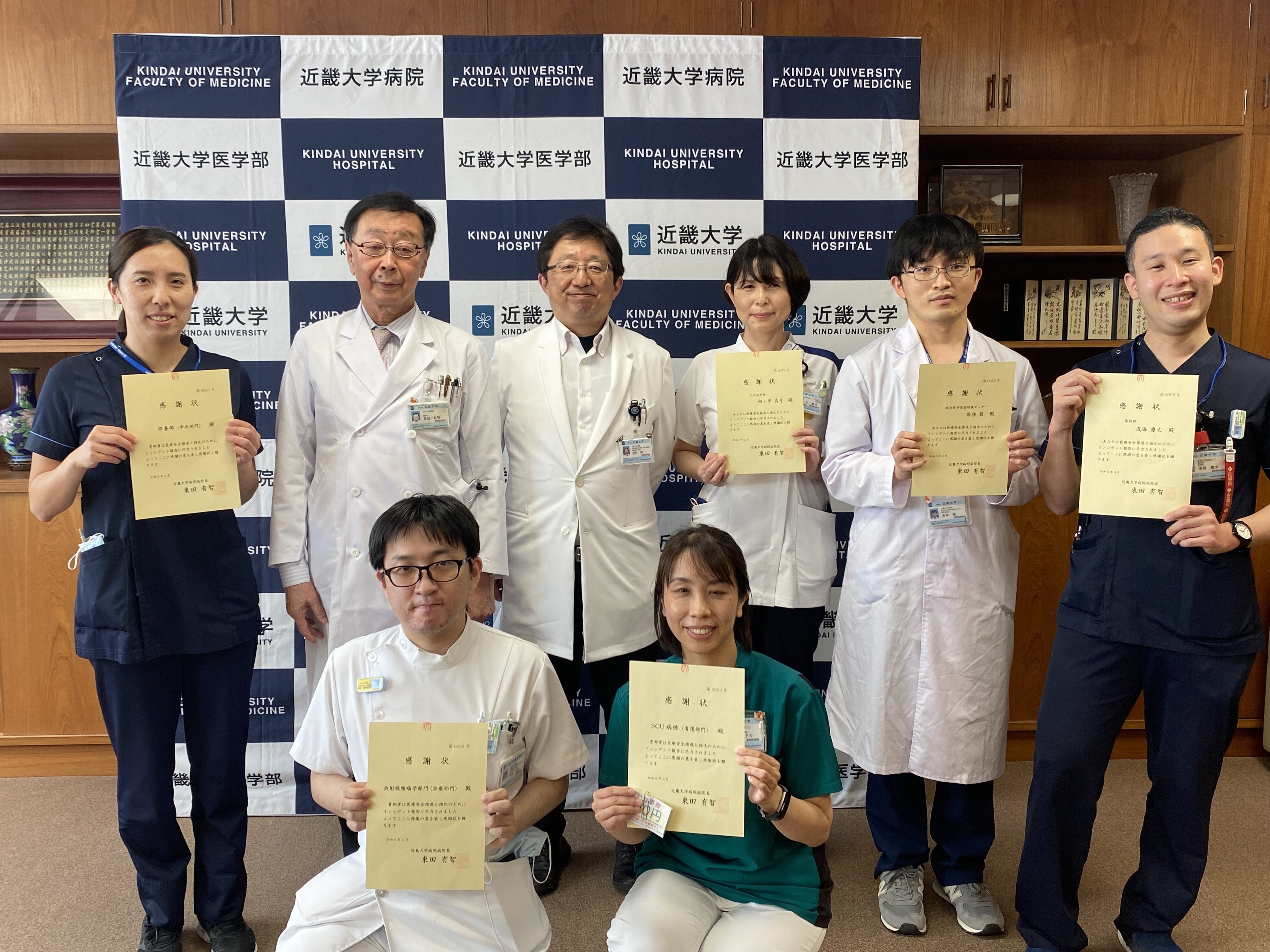 東田病院長(後列左から2番目)辰巳安全対策室長(後列左から3番目)と受賞者の皆さん