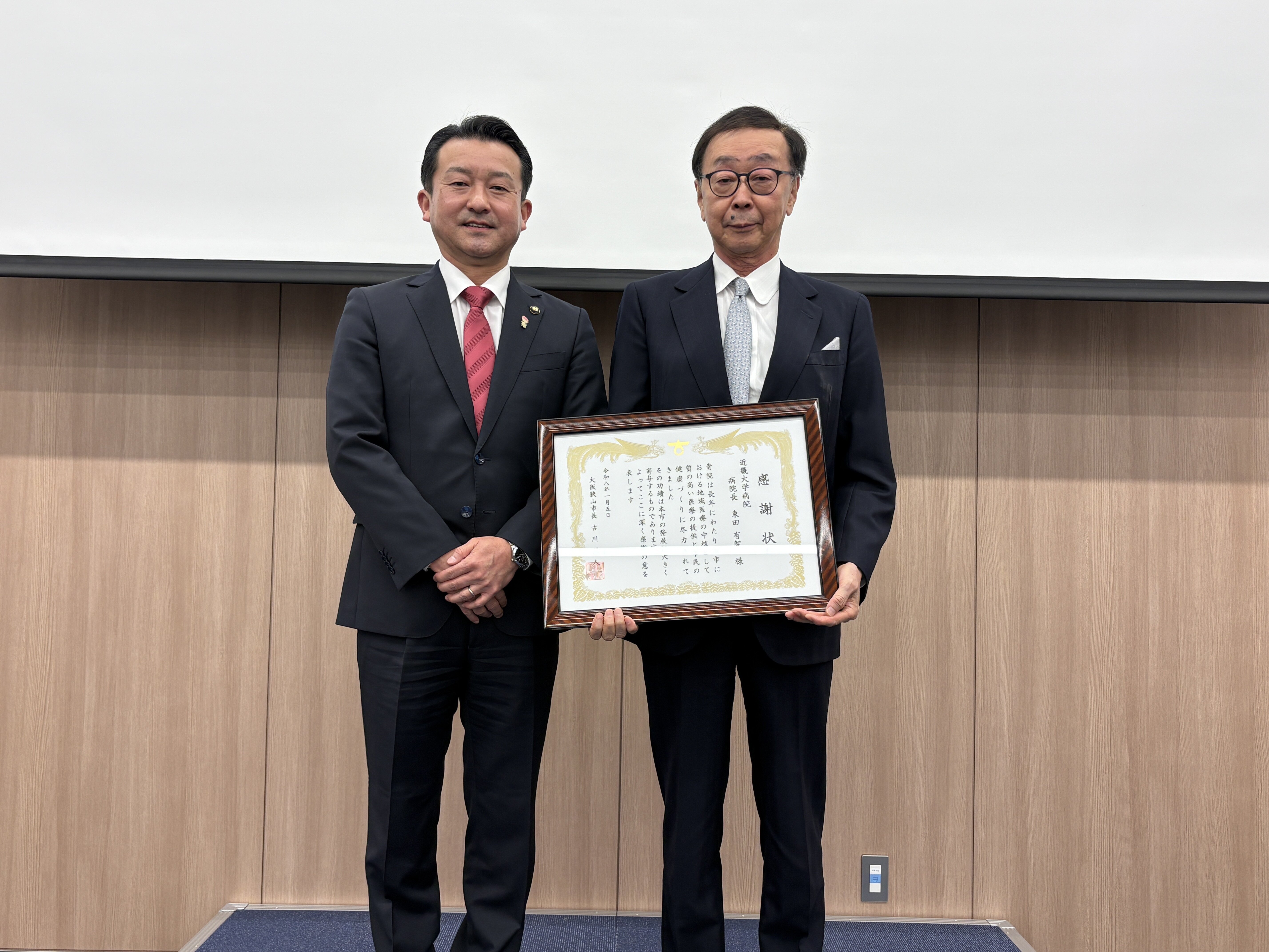 近畿大学病院は、長年にわたり地域医療の中核として質の高い医療の提供と市民の健康づくりに尽力し、大阪狭山市の発展に大きく寄与した功績が認められ、令和8年1月5日、大阪狭山市の古川 照人市長より、感謝状を贈呈いただきました。
