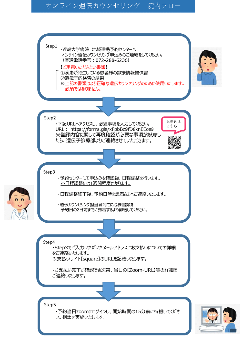 オンライン遺伝カウンセリングを希望された方から、近畿大学病院地域連携課に(072)288-6236に電話申し込みください。