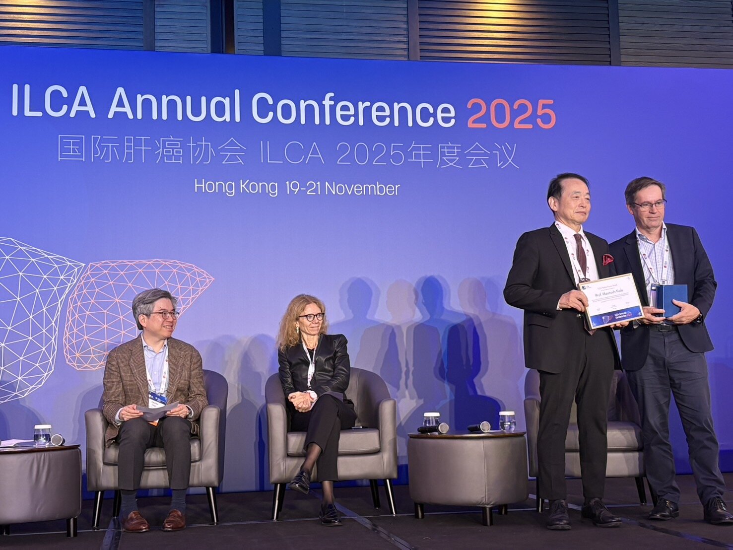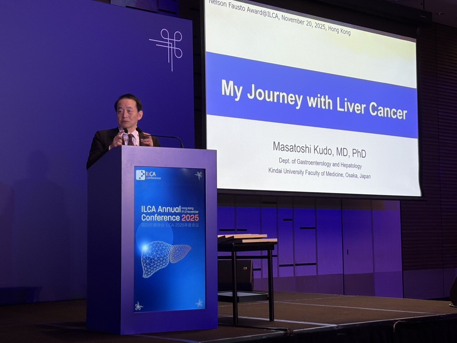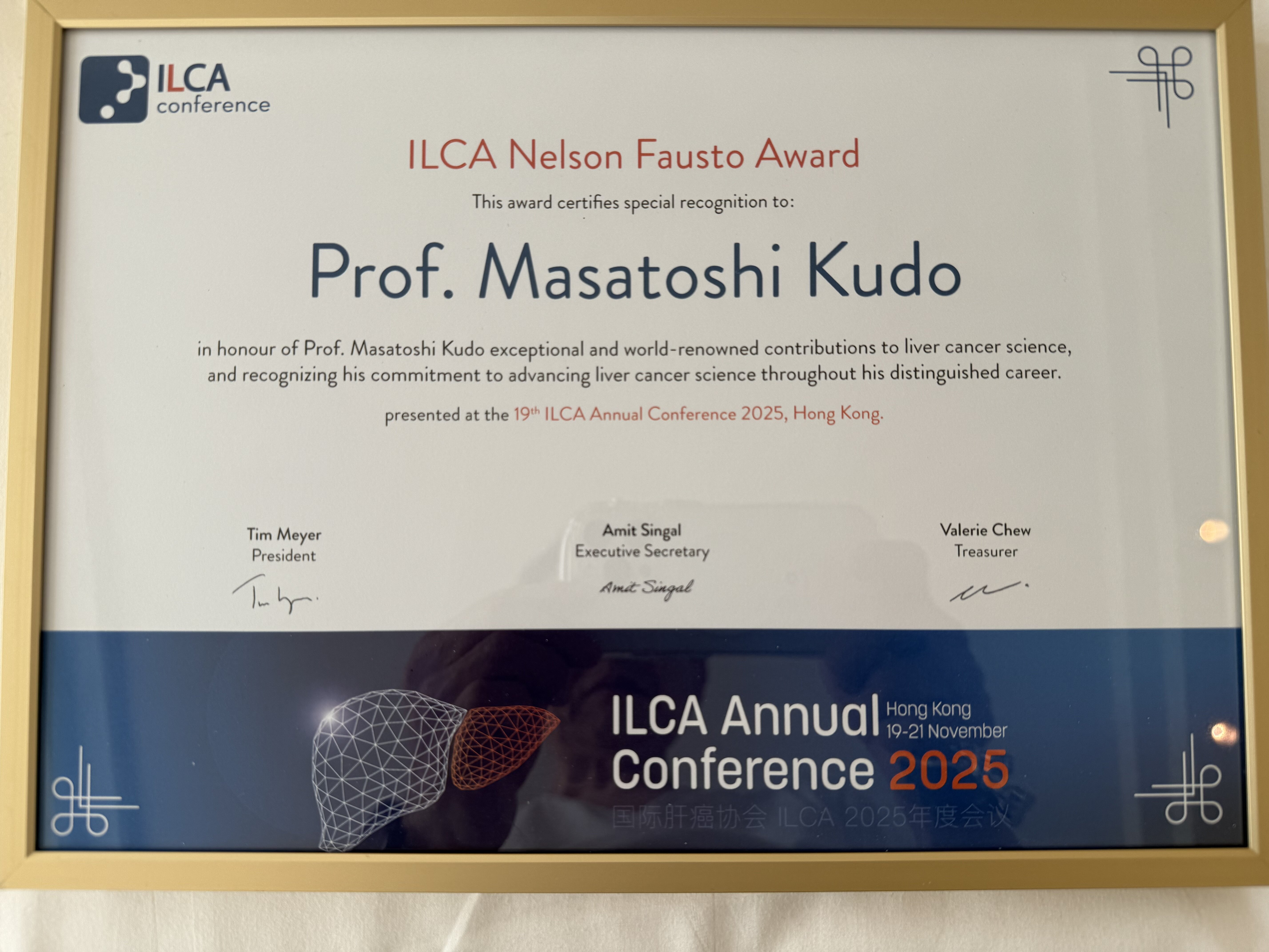 消化器内科主任教授 工藤正俊が国際肝癌学会 (International Liver Cancer Association: ILCA)からNelson Fausto Awardを受賞し2025年11月20日香港で行われた年次学術集会において受賞式ならびに受賞講演を行いました。ILCAのノーベル賞とも称されている同Awardは肝癌の研究で国際的に高い評価を受け卓越した業績を挙げた研究者に贈られるAwardであり日本人の研究者としては初の快挙であります。 |