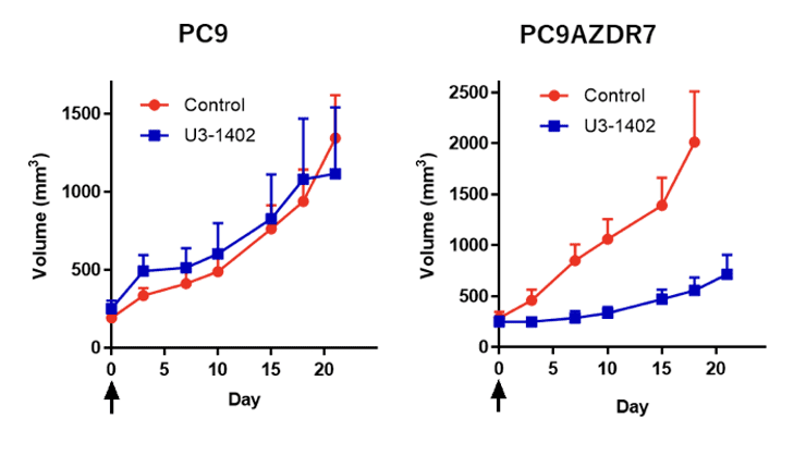 肺がん細胞株を用いて第3世代EGFRチロシンキナーゼ阻害剤オシメルチニブ耐性株を樹立しました。この耐性株ではHER-familyの一員であるHER3の発現亢進を認め、抗HER3抗体薬物複合体U3-1402への高い感受性を示し、企業と共同で特許出願中です。現在、同治療薬はEGFR遺伝子変異陽性肺がんを対象に臨床開発が進行中で、オシメルチニブ耐性例で優れた抗腫瘍効果を発揮し、我々の研究が治療開発に有効活用されています。